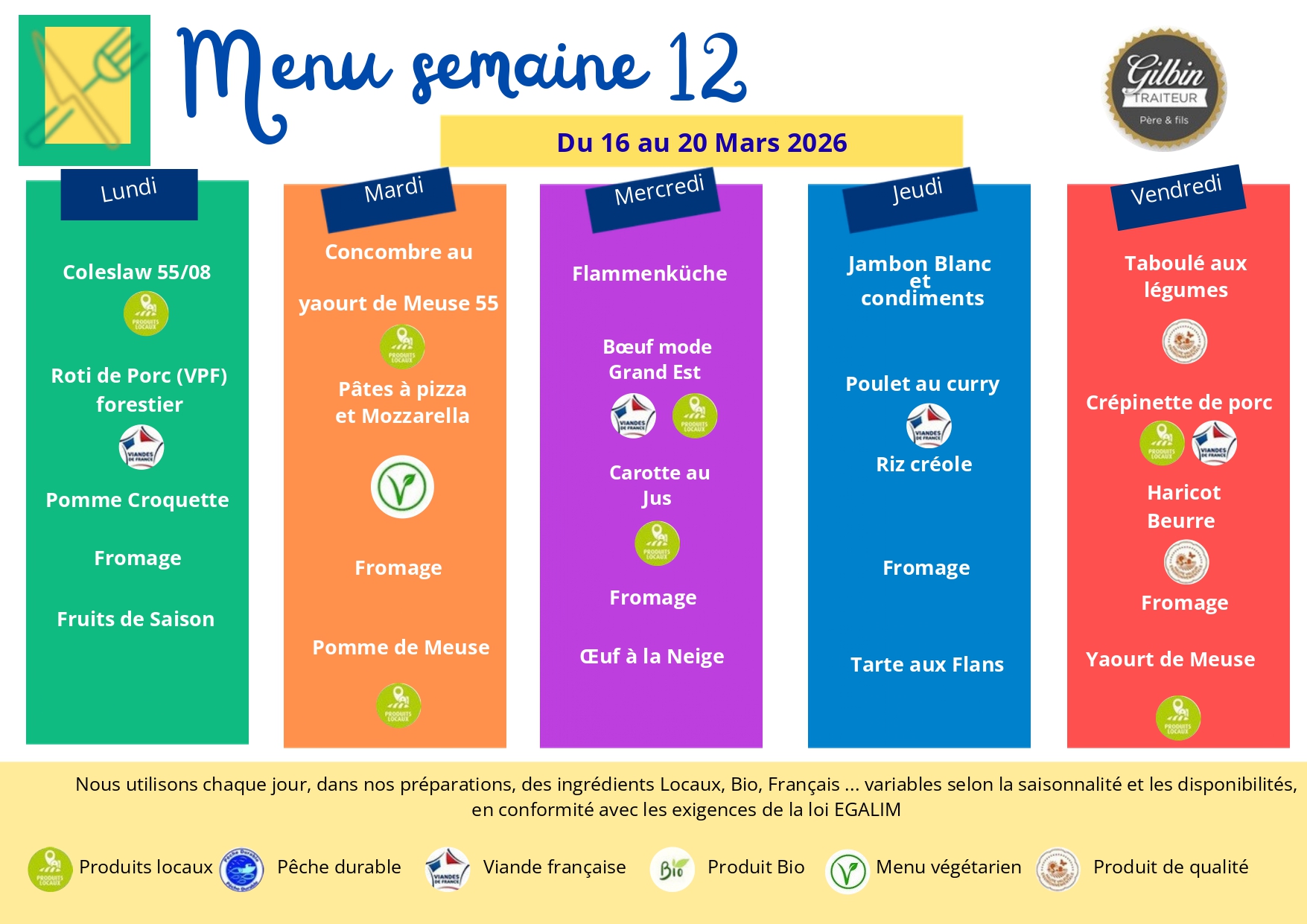Menu de la semaine du 16 au 20 mars 2026